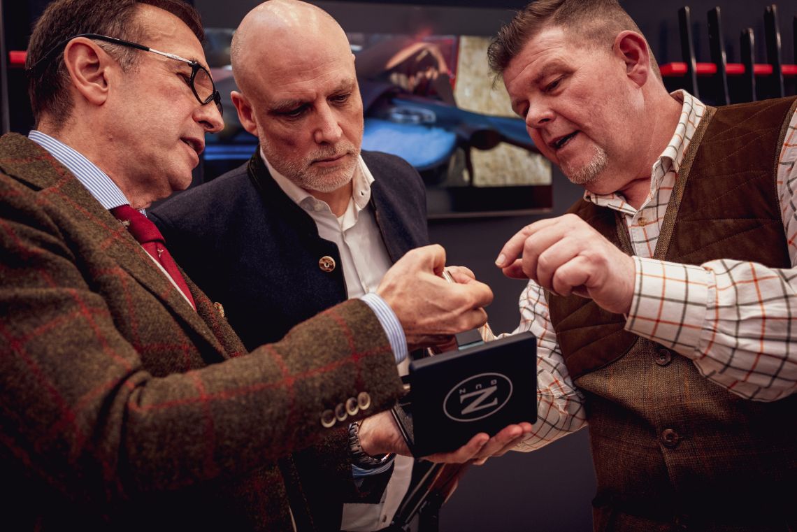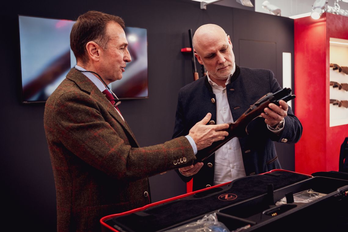 Paolo Zoli demonstrierte bei der Übergabe nicht nur die wichtigsten Funktionen und den fachgerechten Zusammenbau der Waffe, sondern auch die Möglichkeit, die Position des Abzugszüngels millimetergenau anzupassen. Der Schaftrücken ist höhenverstellbar, sodass die Waffe perfekt eingestellt werden kann. Je nach Schießtechnik kann die Flinte auch noch im Nachgang angepasst werden. Mit der passenden Kombination der beigelegten Chokes ist Jeremy Glück für jede Situation bestens gerüstet. Seine Vorfreude auf die ersten Schüsse ist groß, und Paolo Zoli ist sich sicher, dass diese Maßanfertigung unserem Geschäftsführer viel Freude bereiten wird!